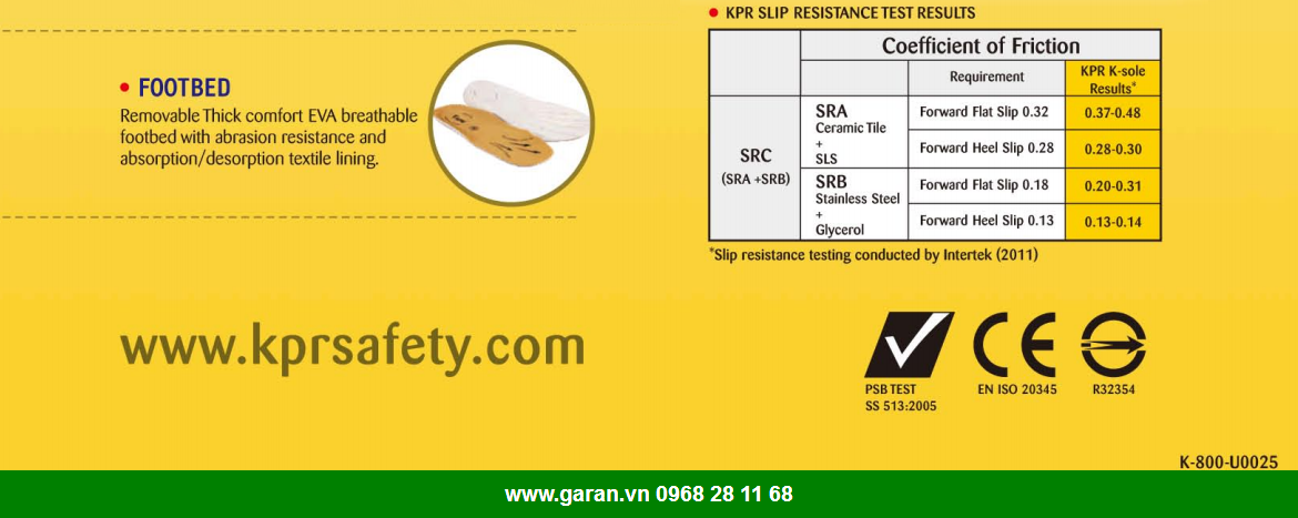 Các đặc tính kỹ thuật của giày K800S1P như sau:
